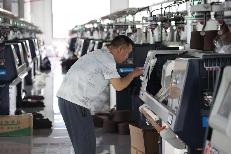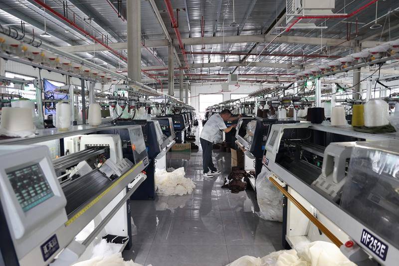 走进生产车间,电脑横机轰鸣不绝于耳。一台台缝纫机摆放整齐,工人们正忙碌地进行缝盘、缝制、整理衣料等工作。